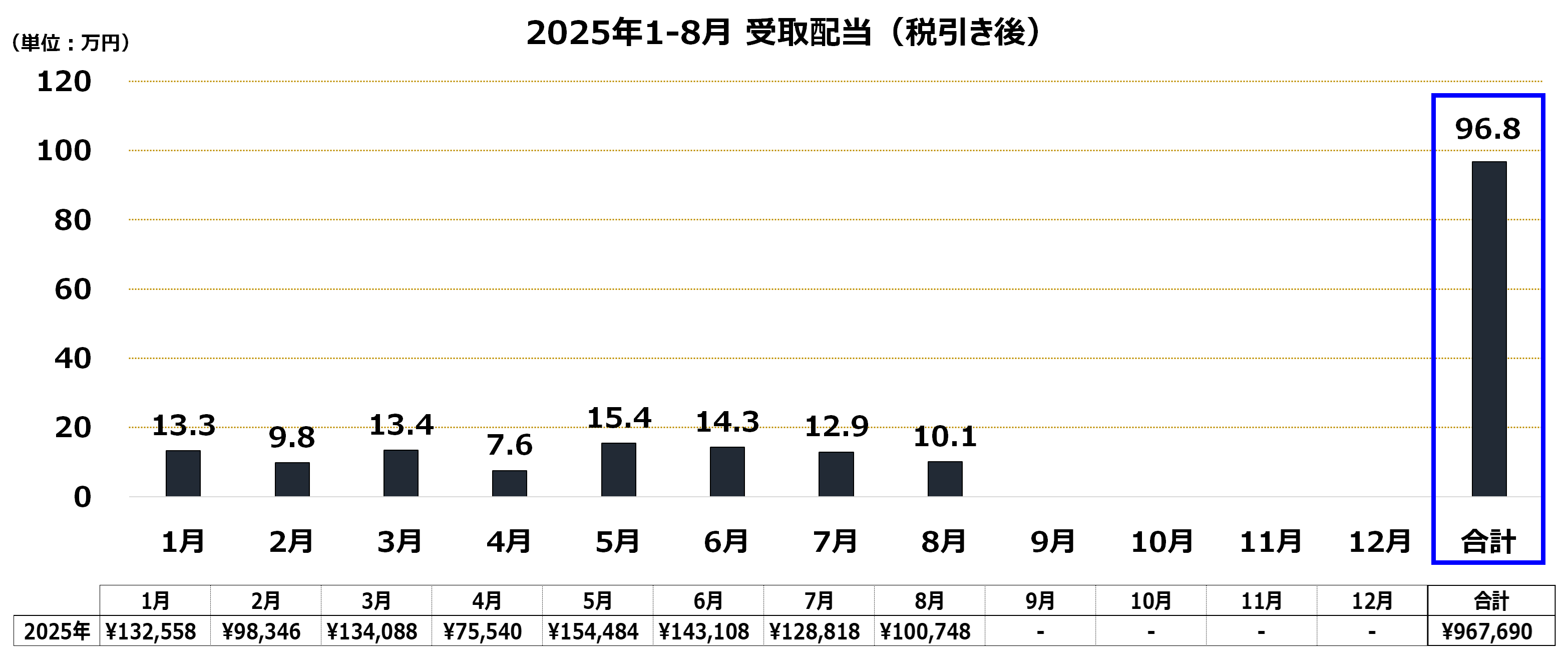 2025年1-8月の受取配当合計(税引き後)は約96.8万円。
