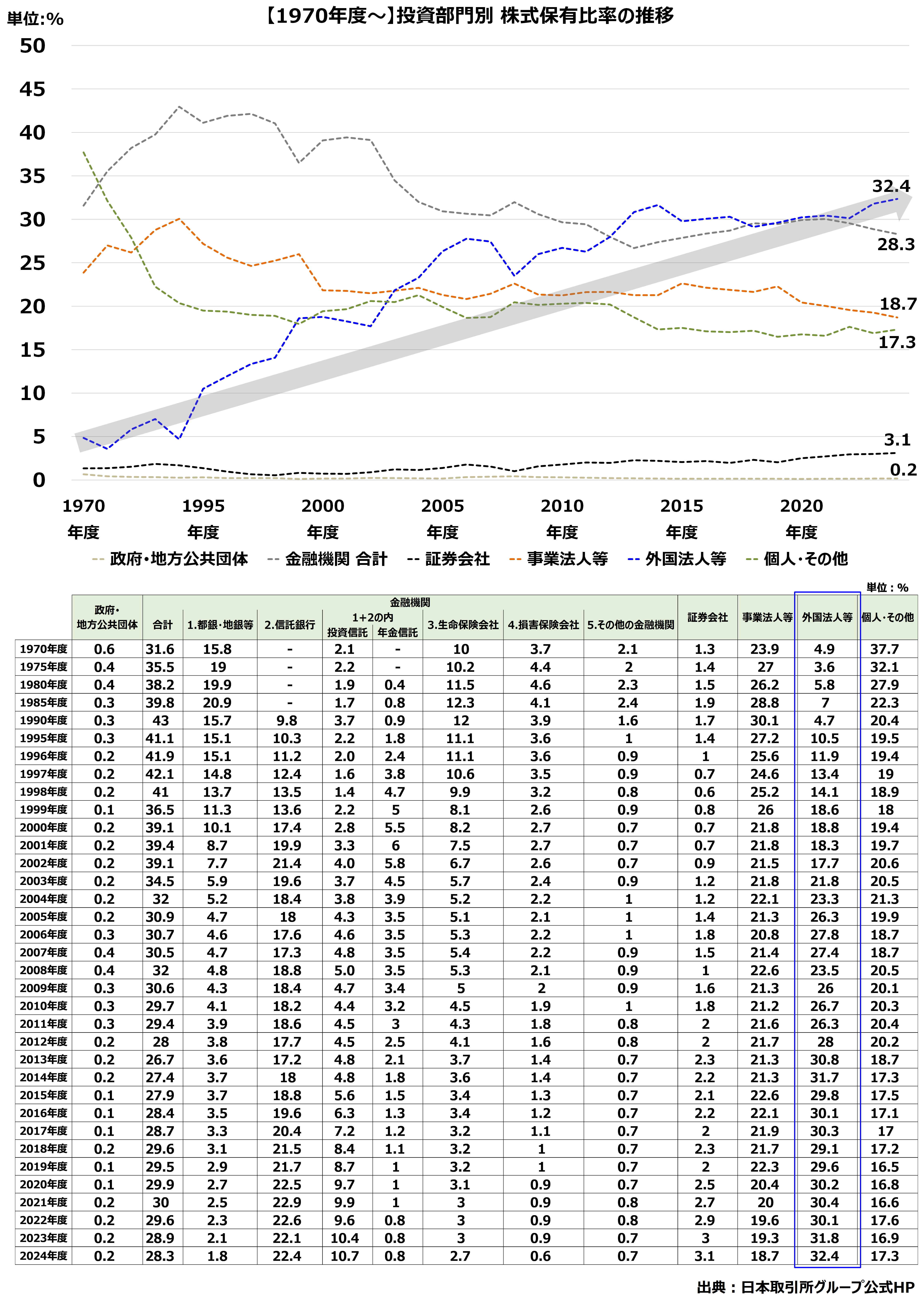 年々、「外国法人等」の株式保有比率が高まり、2013年度に30%を超えました。