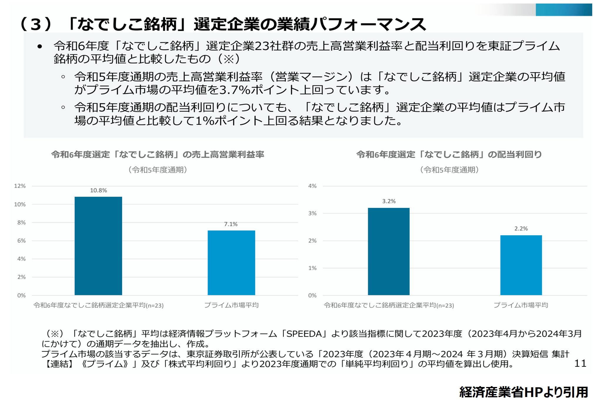(9) 『令和6年度「なでしこ銘柄」選定企業23社群の令和5年度通期の売上高営業利益率と配当利回りが、東証プライム銘柄の平均値より優れている(売上高営業利益率は3.7%ポイント、配当利回りは1%ポイント上回る)』こと