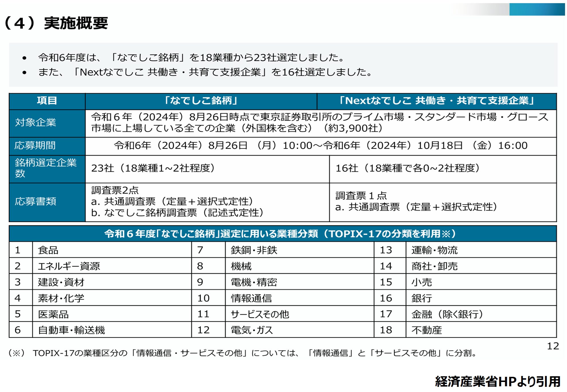では、これから、『「なでしこ銘柄」が「準利権銘柄」と言えるかどうか』を判断するために、「なでしこ銘柄」と「Nextなでしこ 共働き・共育て支援企業」の概要を見ていきます。