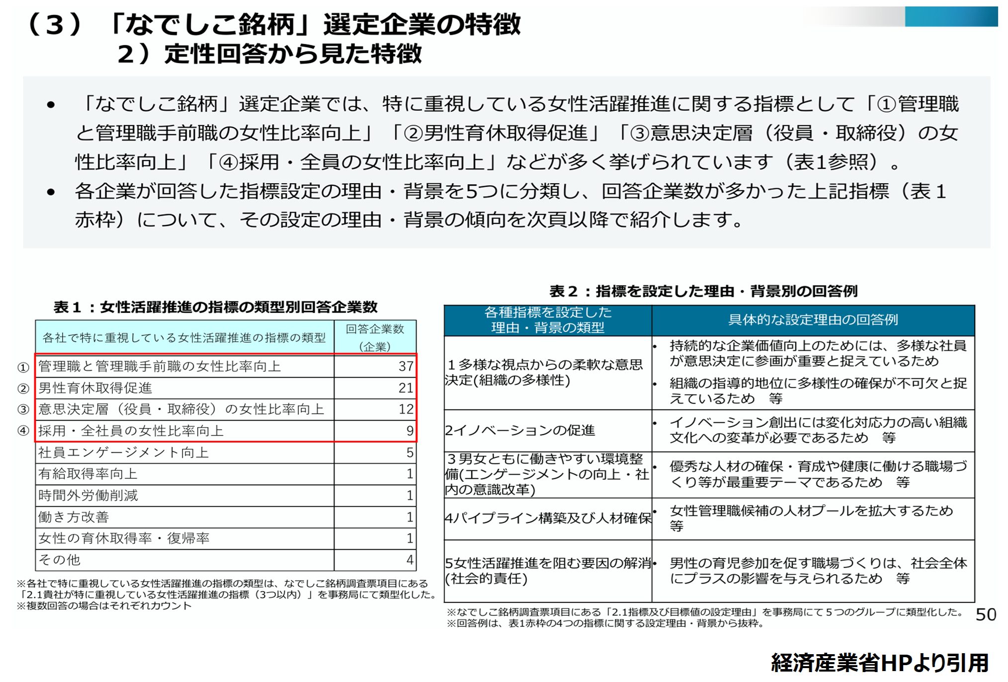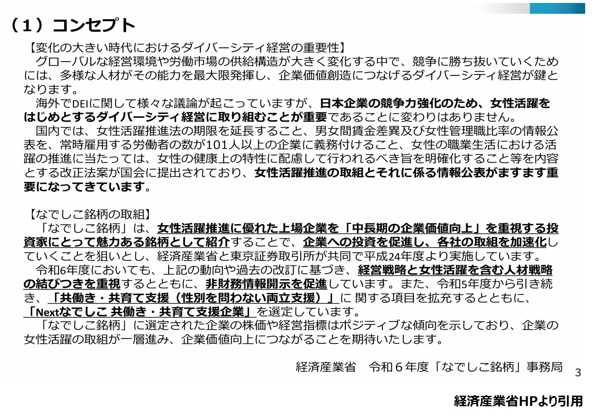 (2) 「なでしこ銘柄」選定の狙いは、『女性活躍推進に優れた上場企業を「中長期の企業価値向上」を重視する投資家にとって魅力ある銘柄として紹介し、企業への投資を促進し、各社の取組を加速化していく』こと