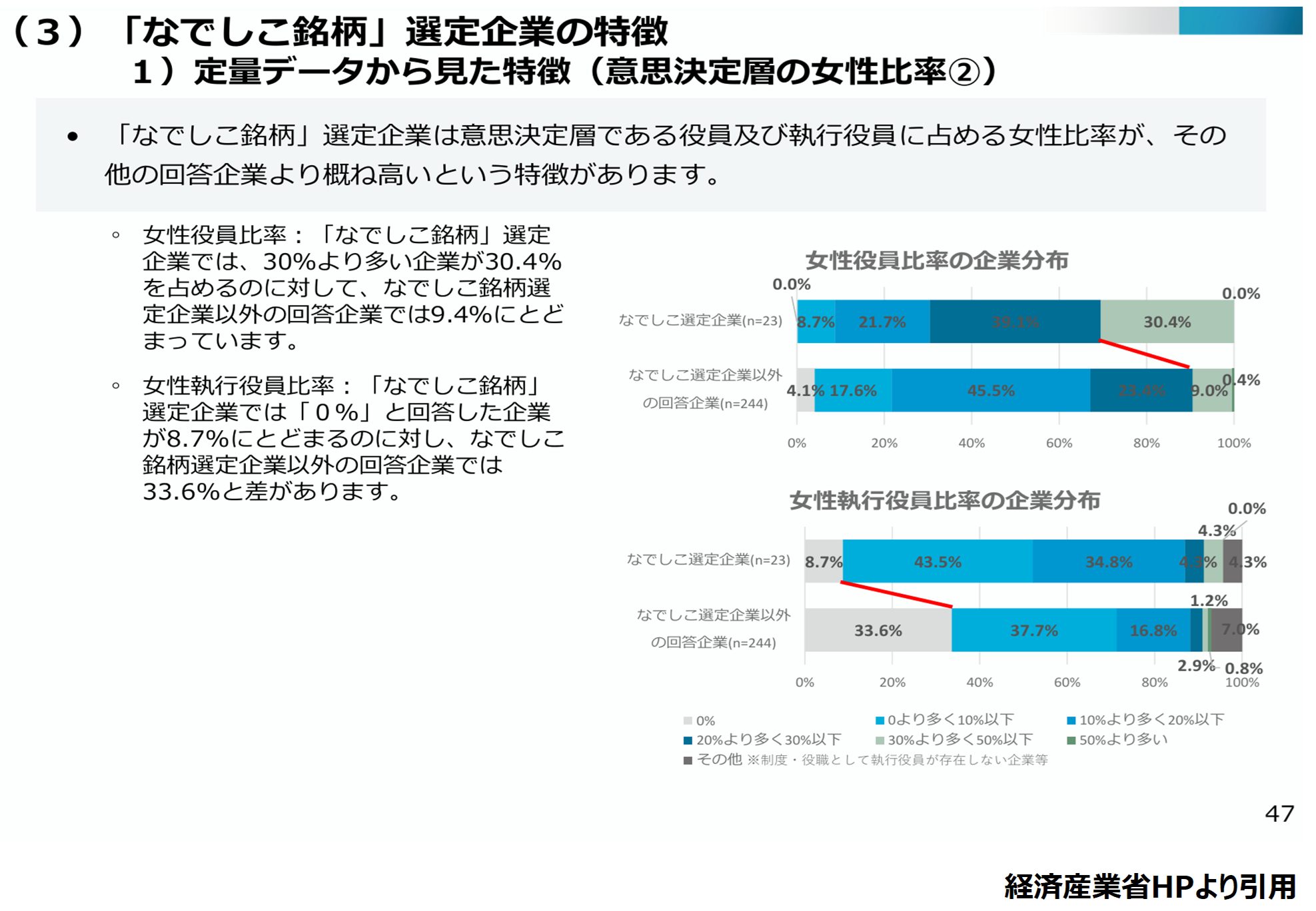 『「なでしこ銘柄」と「Nextなでしこ 共働き・共育て支援企業」選定意義』からは、『「なでしこ銘柄」に選定された時点で、投資家にキャピタルゲインをもたらす能力に評価が下され、一定のお墨付きを得ているのか』は判断することができませんでした。