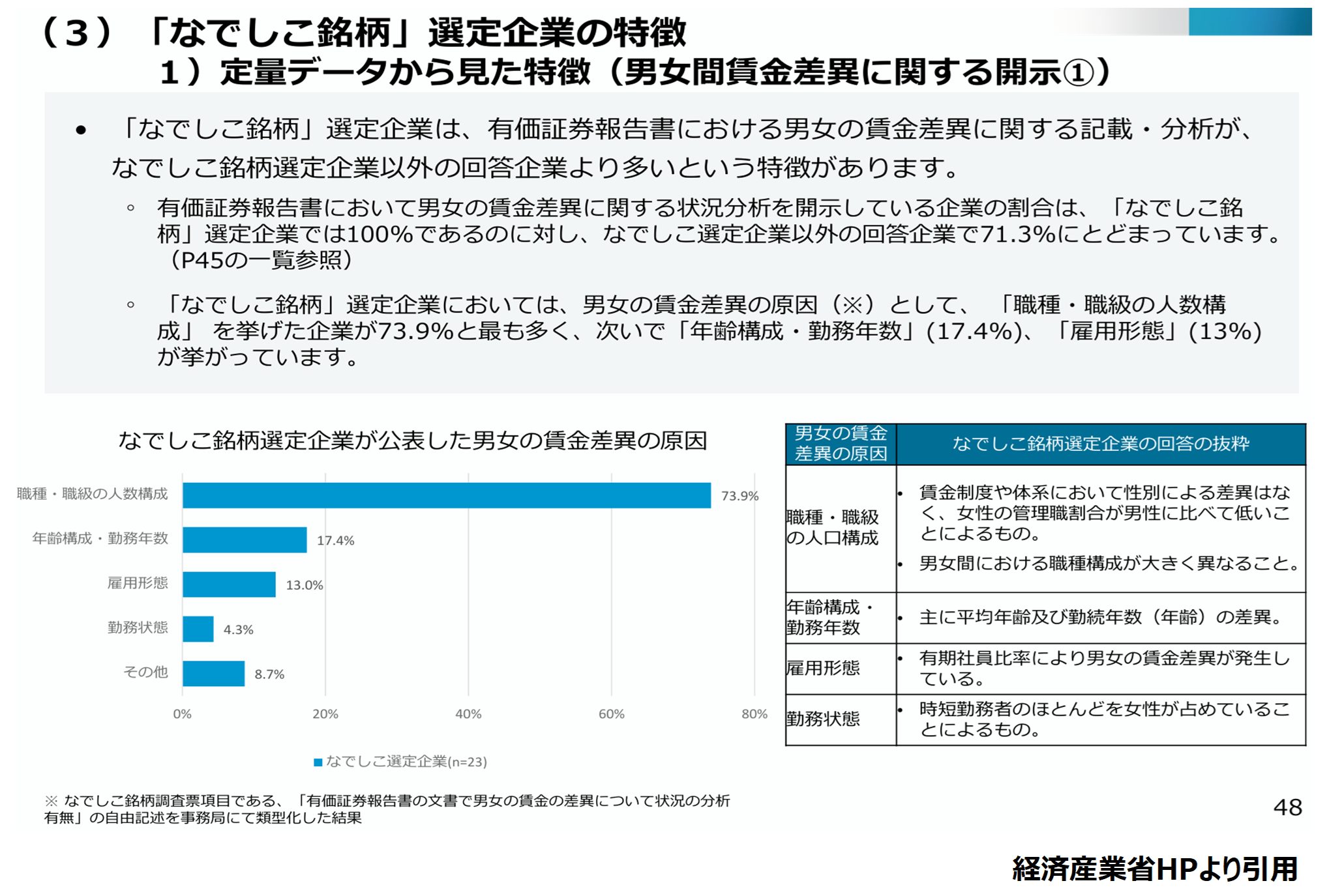 (1)、(3)、(4)、(5)、(6)と(7)を見ると、「なでしこ銘柄」は、『男女間の「結果の平等」を推進している企業』とほぼ同義なのではないかと思います。