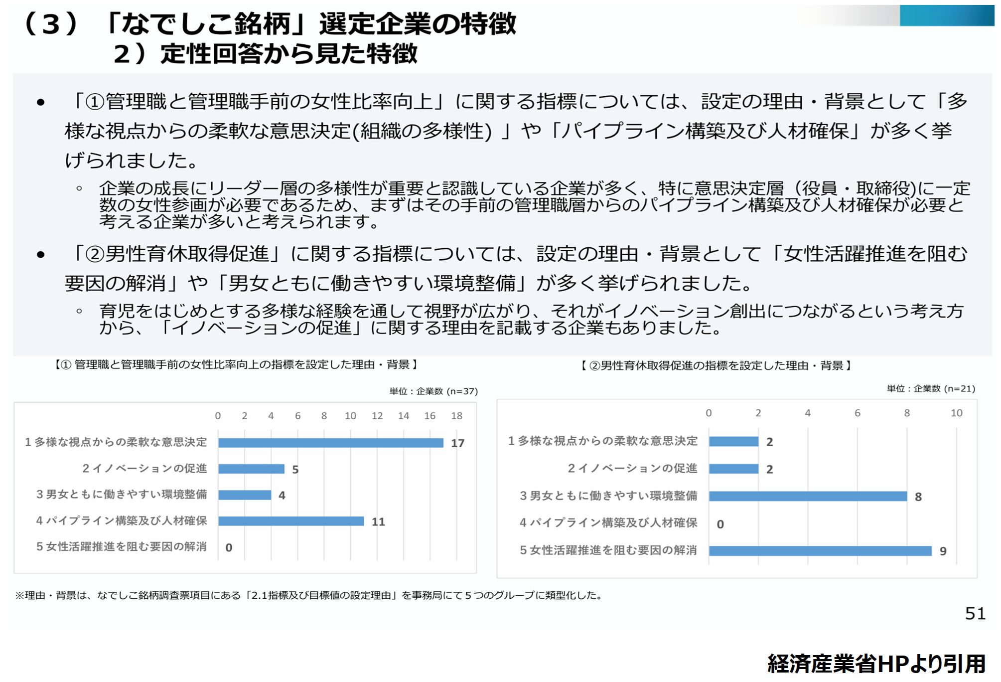 平成24年度(2012年度)より、経済産業省と東京証券取引所が共同で、「女性活躍推進」に優れた上場企業を「なでしこ銘柄」として選定し、発表しています。