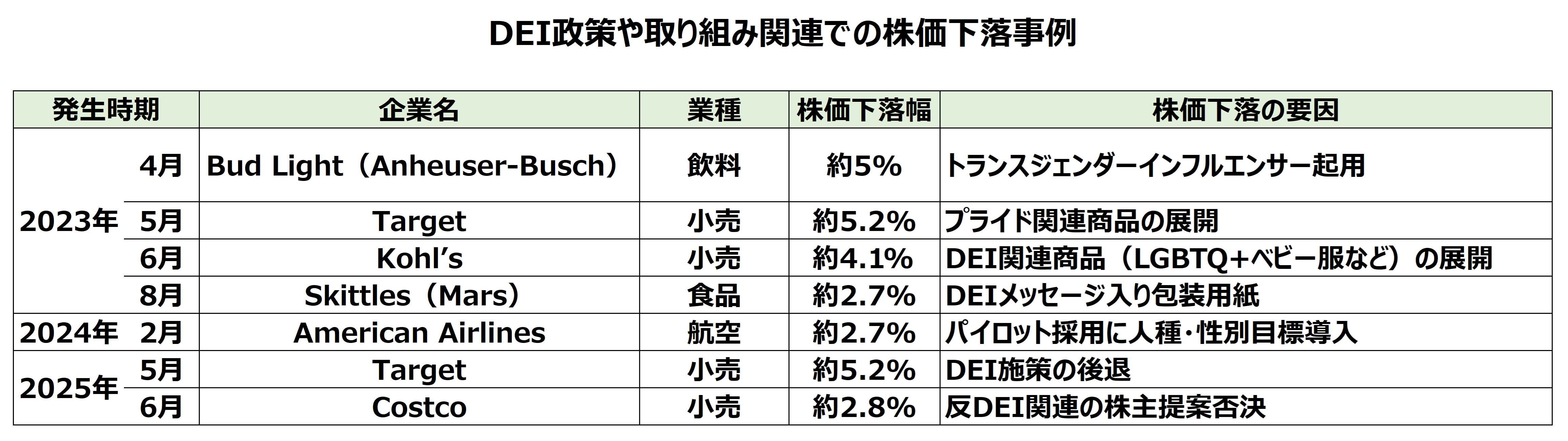 実際に批判を受けたDEI関連の政策や取り組み(性別関連、人種関連、信条関連と身体的特徴関連)と株価下落の原因となった、DEI政策や取り組みの一例を掲載します。