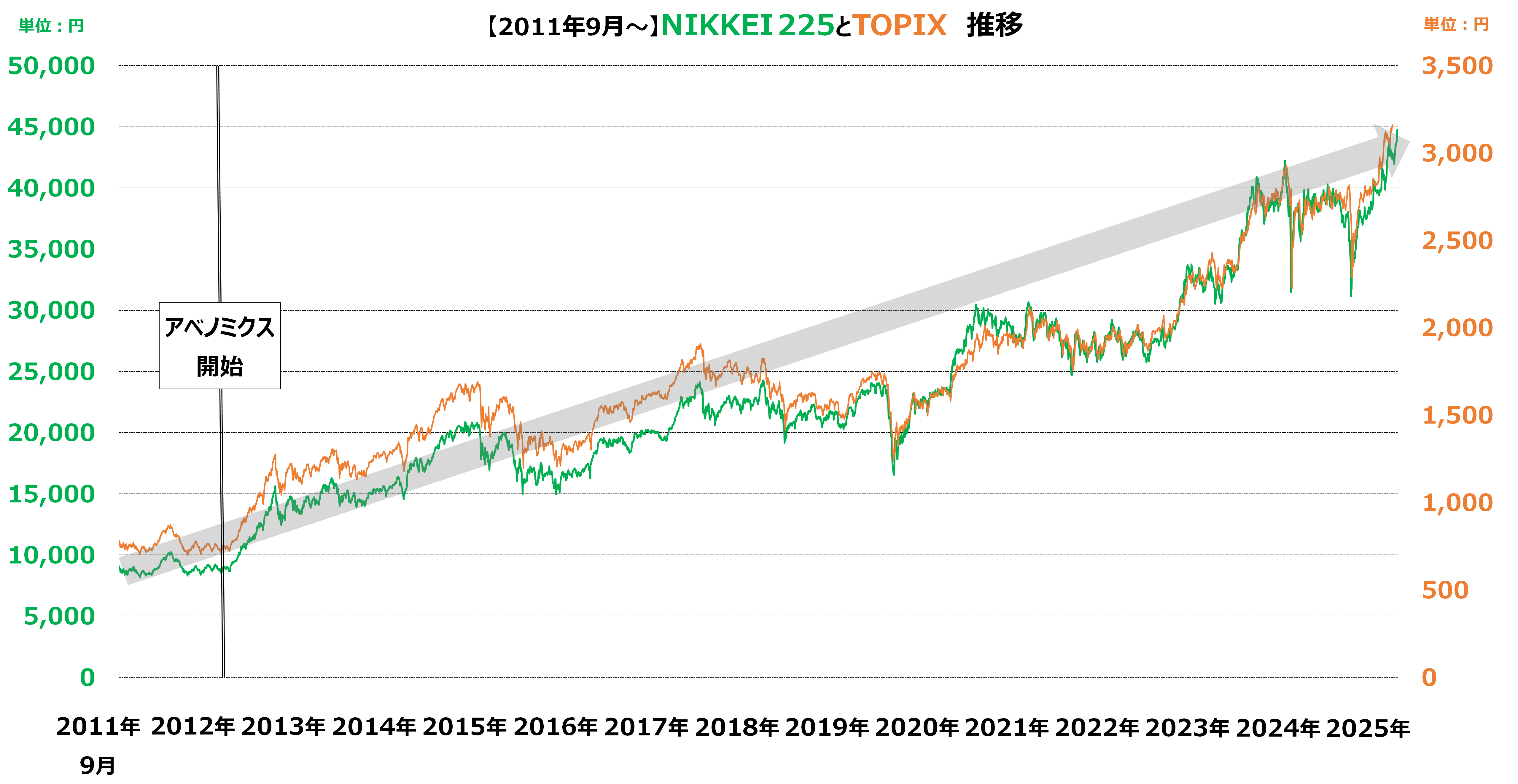 NIKKEI 225とTOPIXの動きを、「アベノミクス」開始直後まで遡って見てみると、「アベノミクス」により浮力を得て、一気に浮上したのが一目瞭然です。