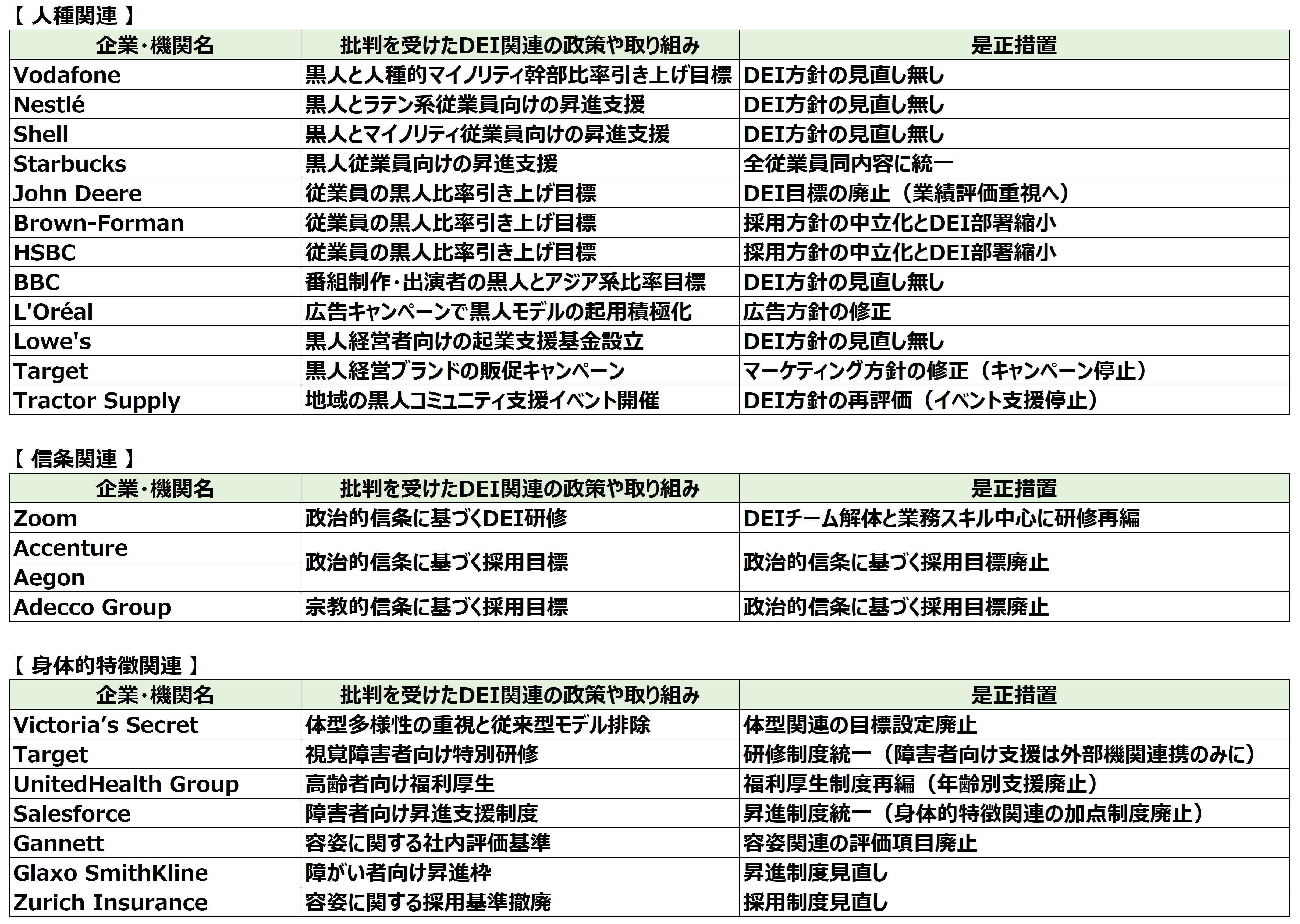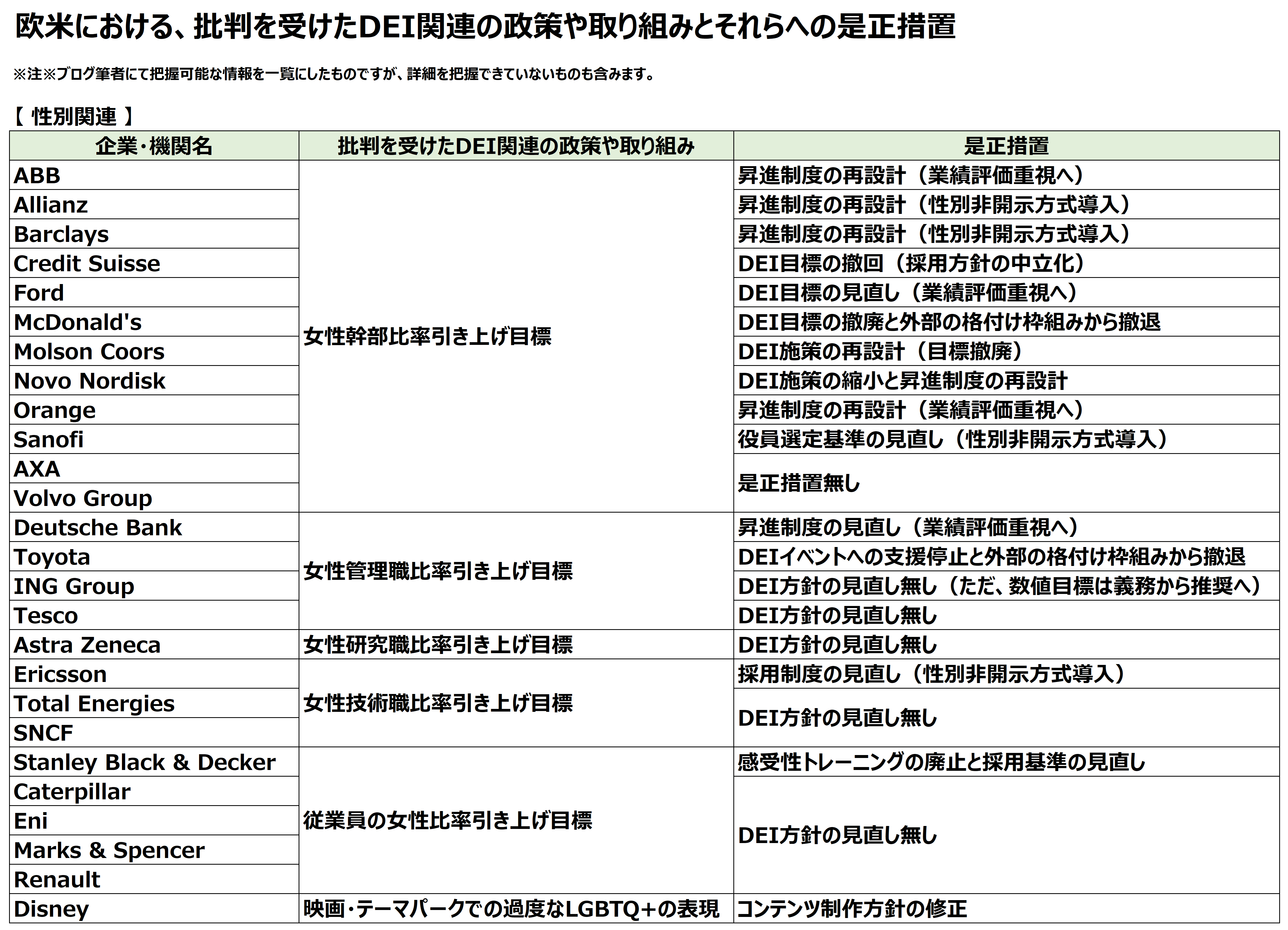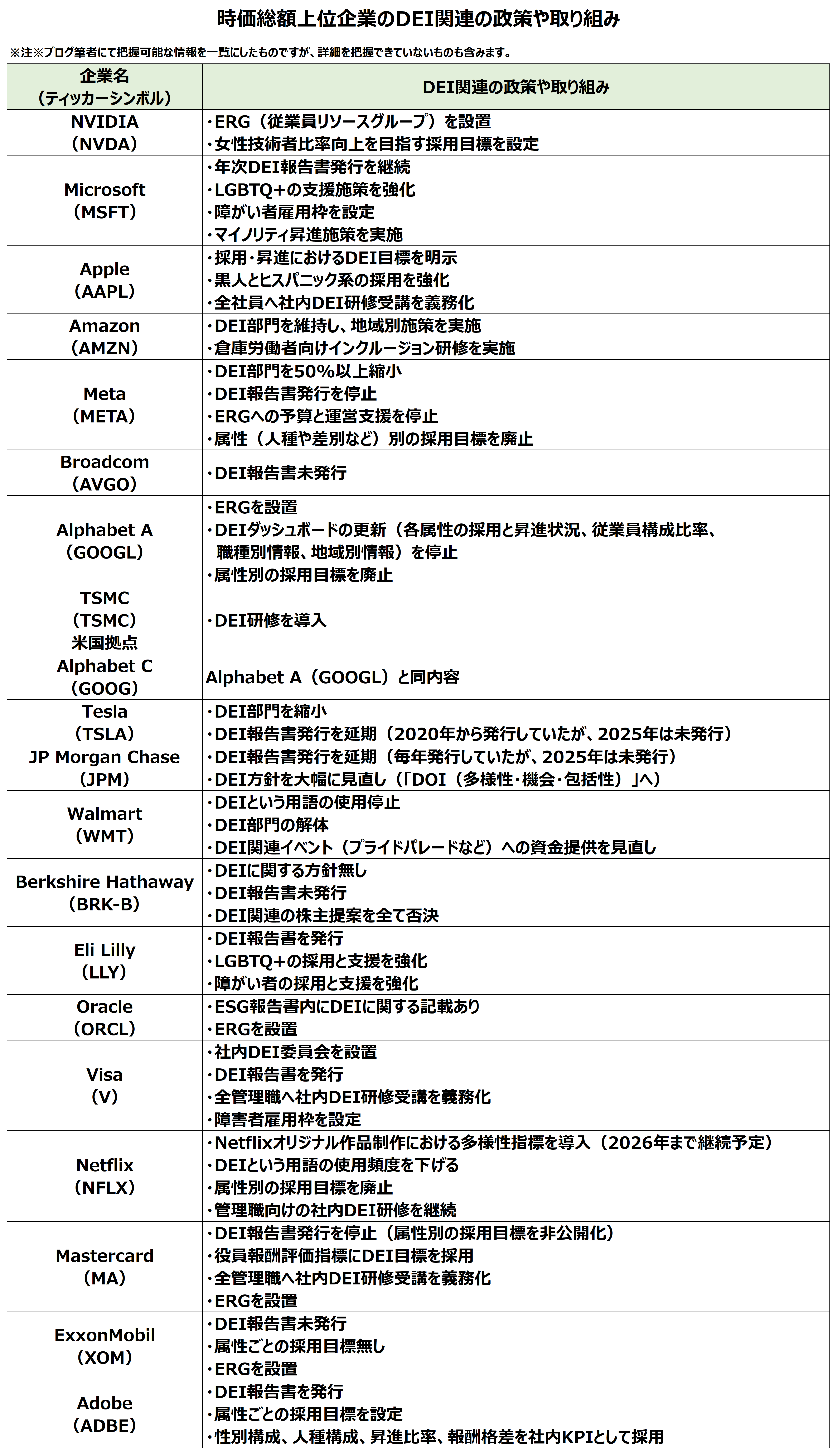 ◆各企業のDEI政策に関する情報は、ブログ筆者にて把握可能なものを記載していますが、詳細を把握できていないものも含まれます。