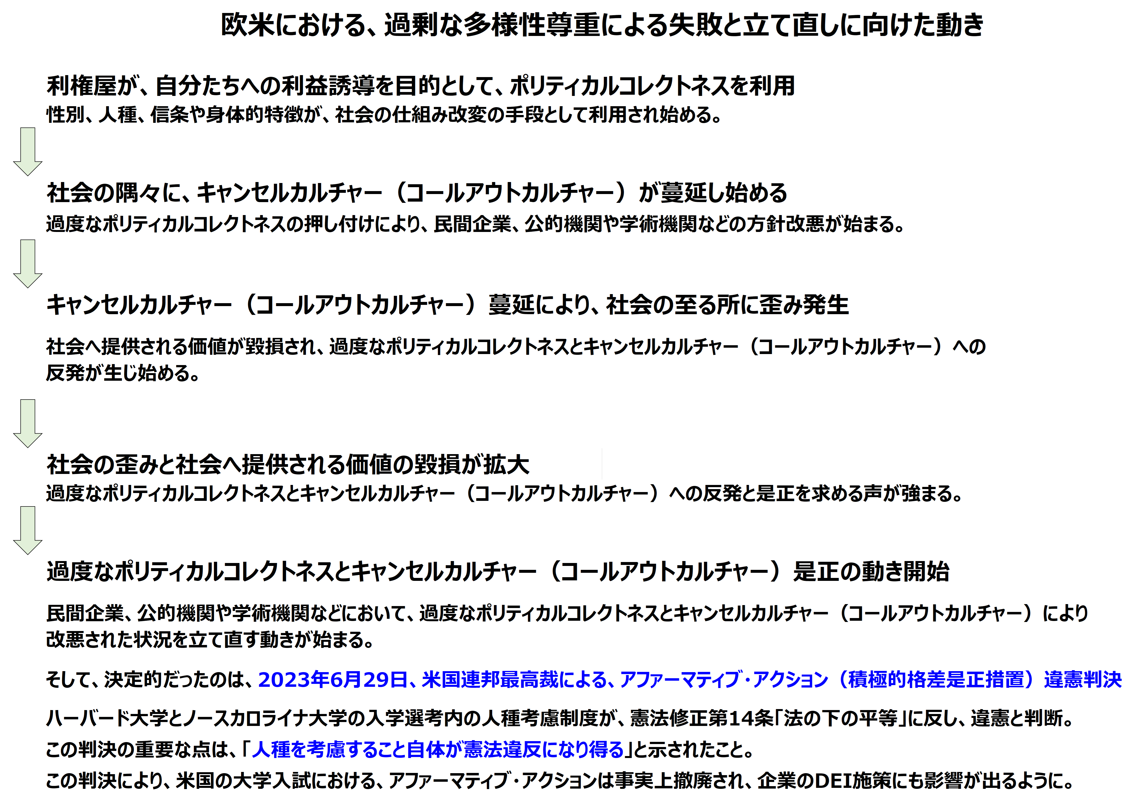 欧米を中心に、過剰なDEI政策により引き起こされた問題とそれらの是正措置についてより詳細な説明をすべきでした。