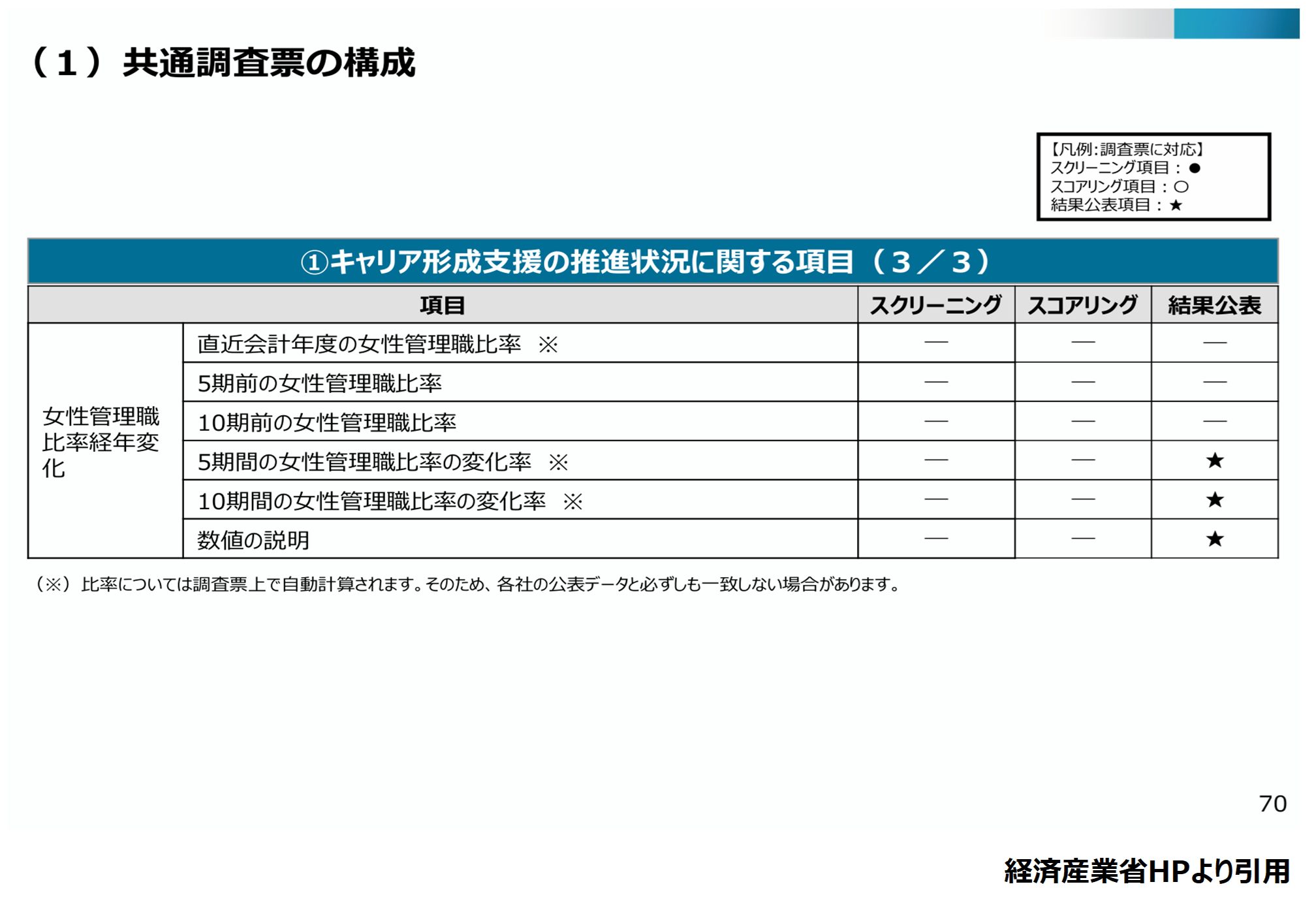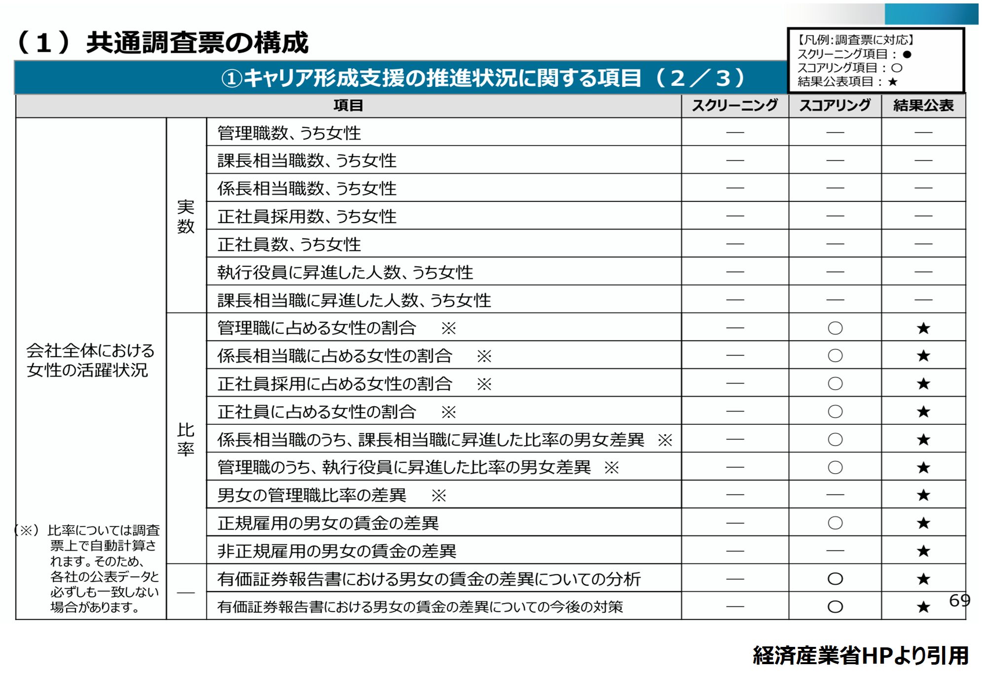 (10) 「役員等における女性比率」と「階層別の女性比率等とそれらの男女差異」も評価対象になっていること