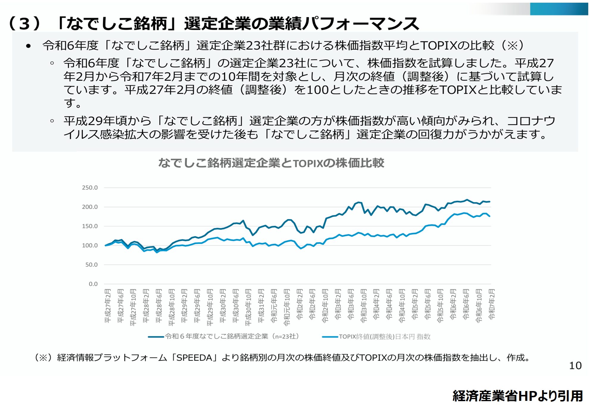 株価が好調な企業もあれば、そうでない企業もありますので、令和6年度「なでしこ銘柄」選定企業23社を個別に見る必要があります。