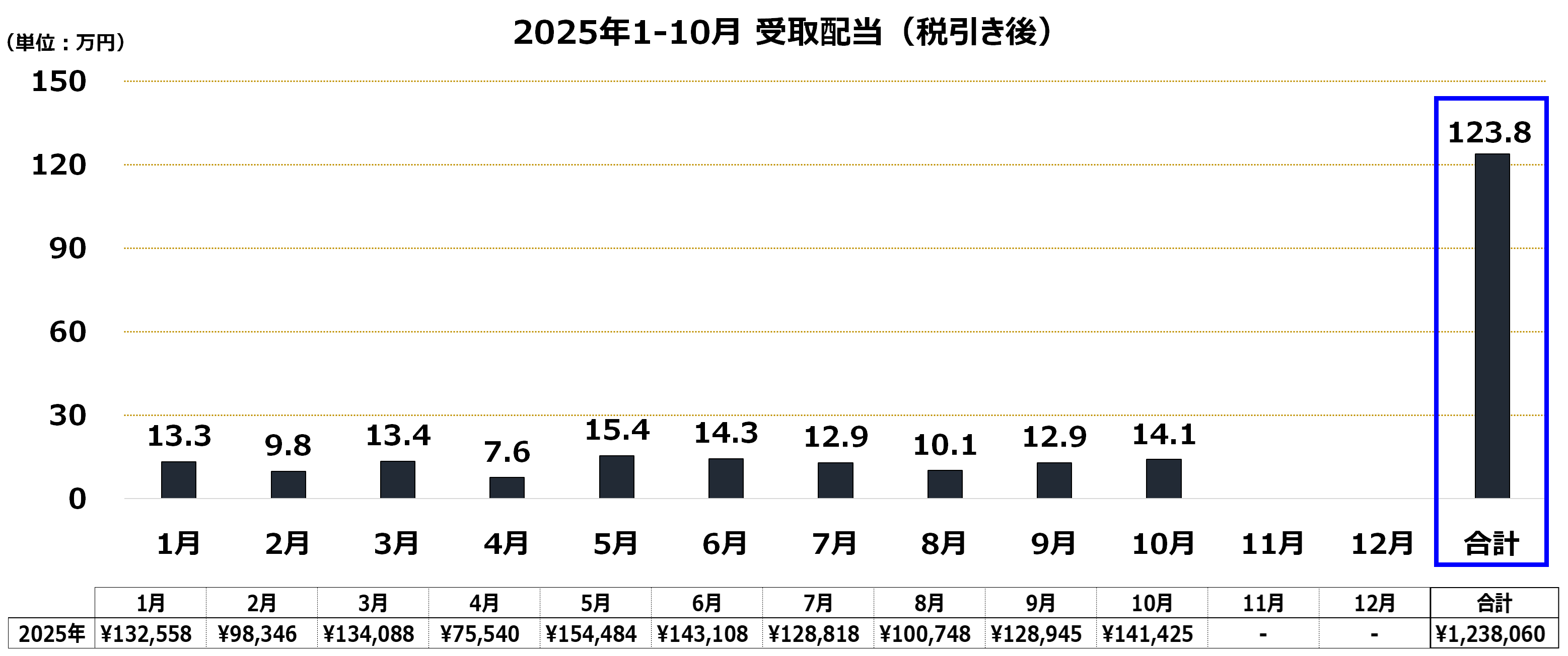 2025年1-10月の受取配当合計(税引き後)は約123.8万円。