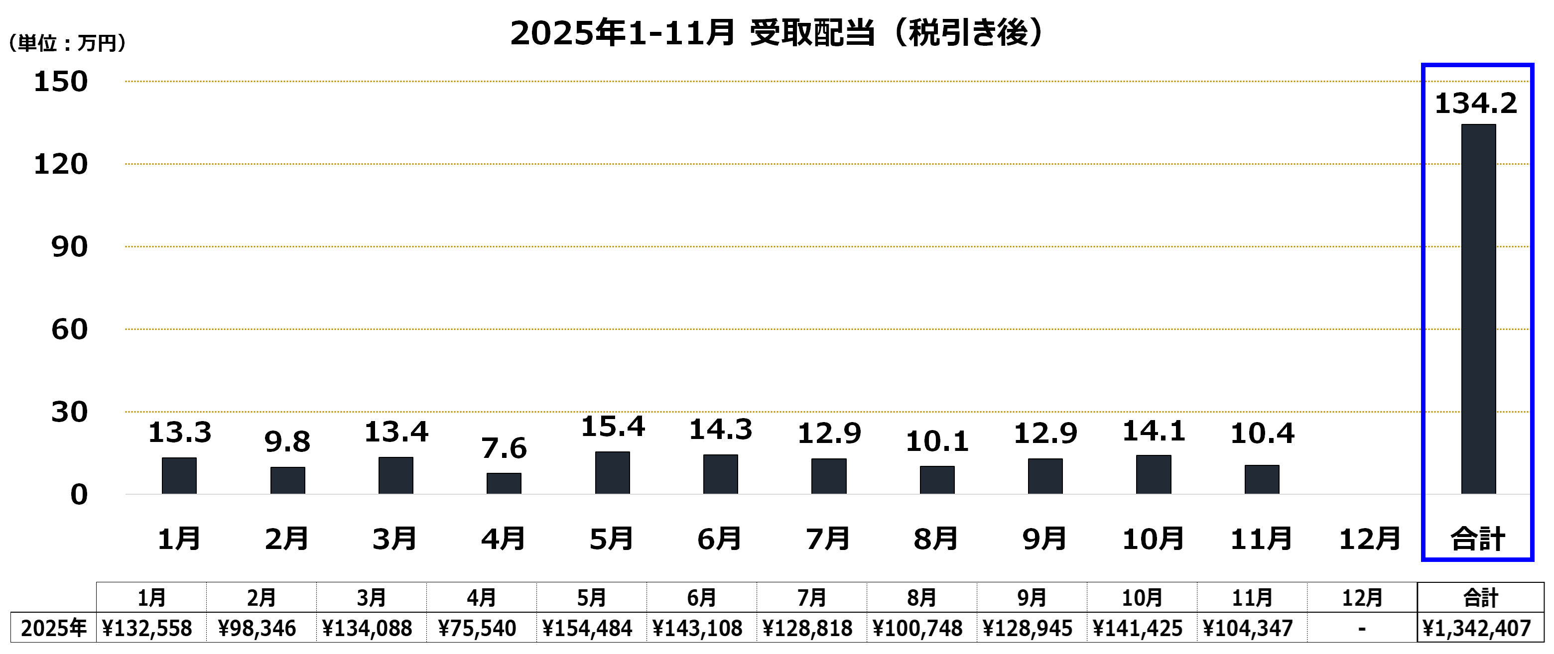2025年1-11月の受取配当合計(税引き後)は約134.2万円。