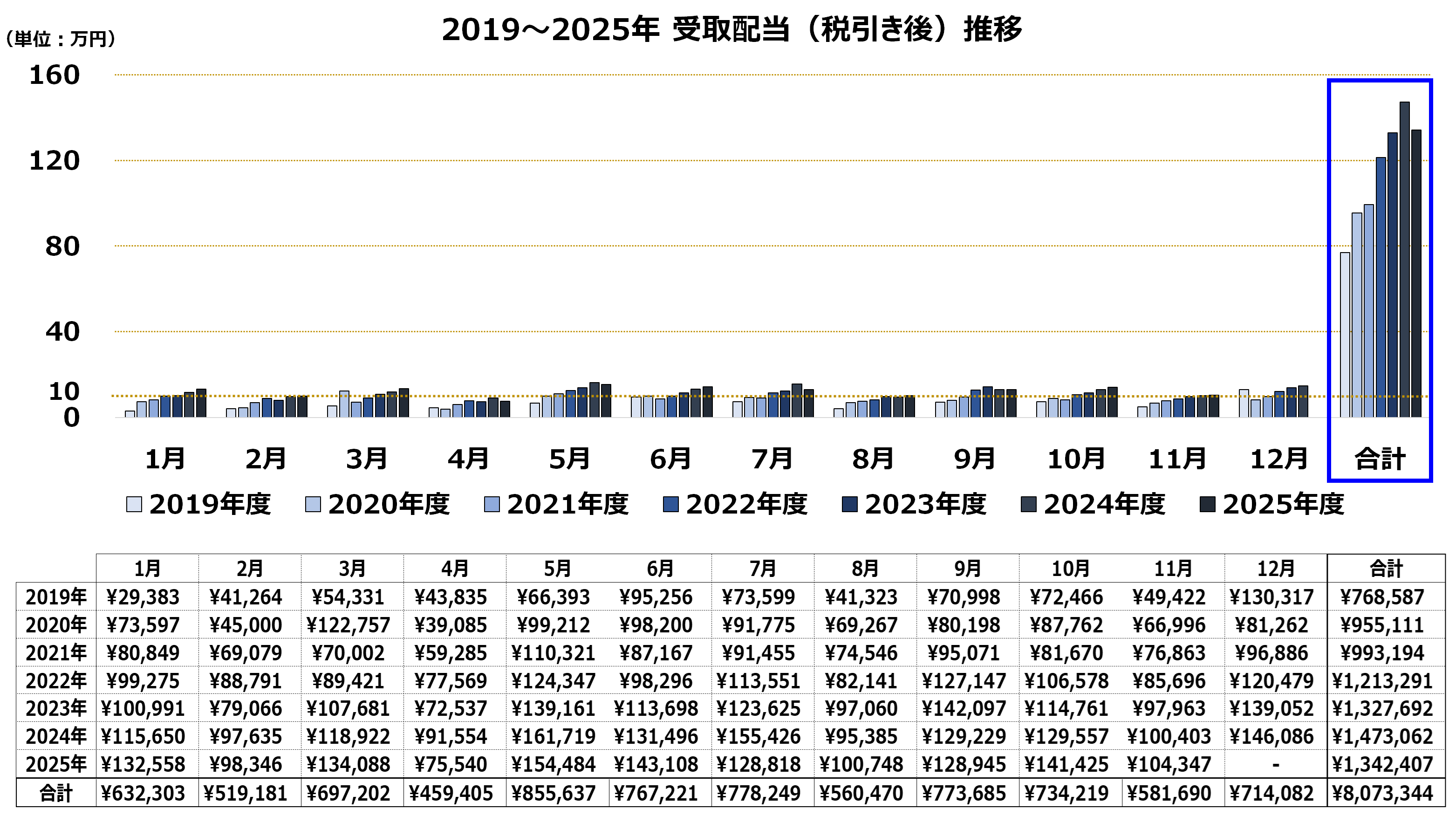 2019年から2025年11月までに約807万円の配当を受け取りました。