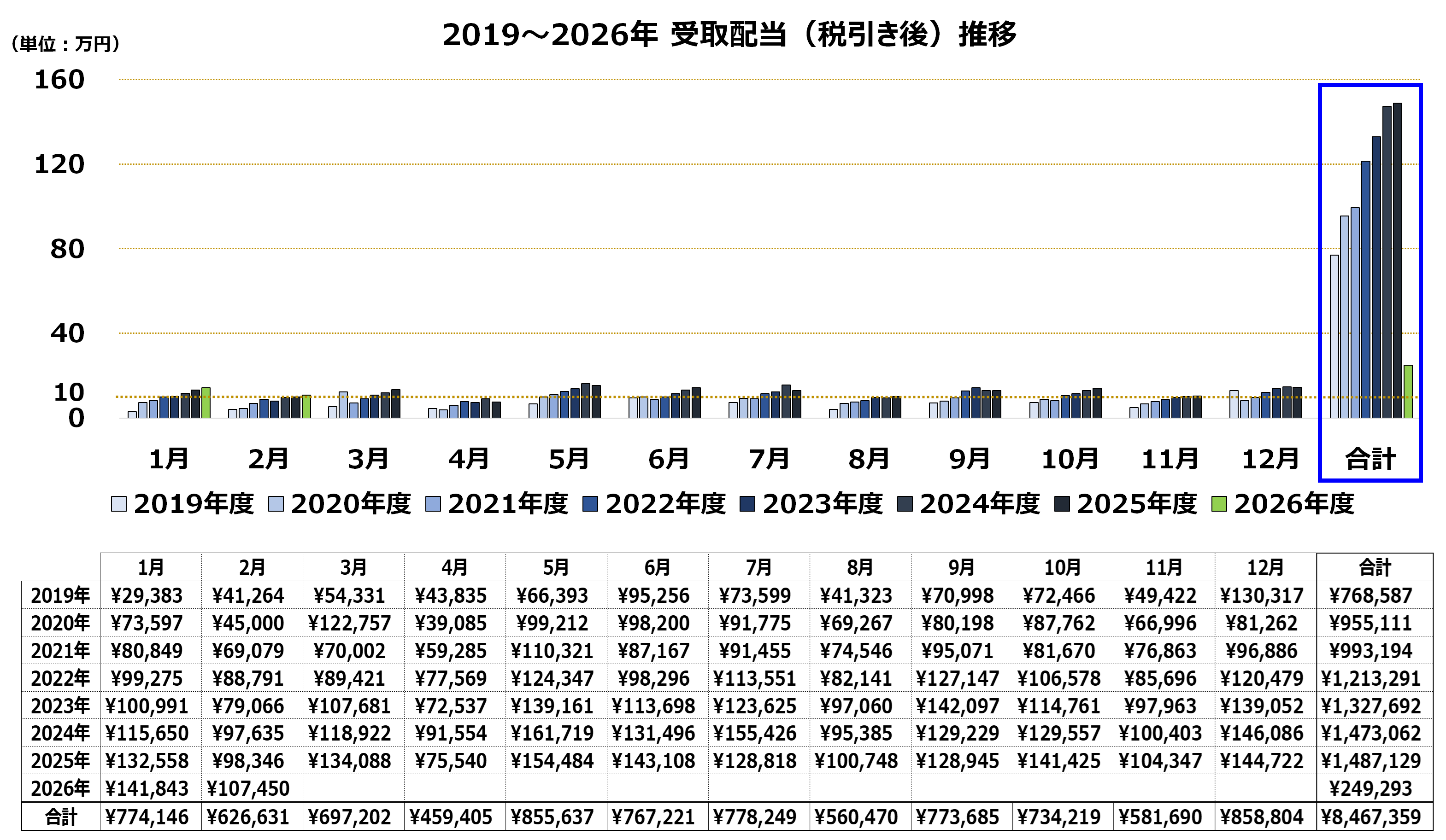 2019年から2026年2月までに約847万の配当を受け取りました。