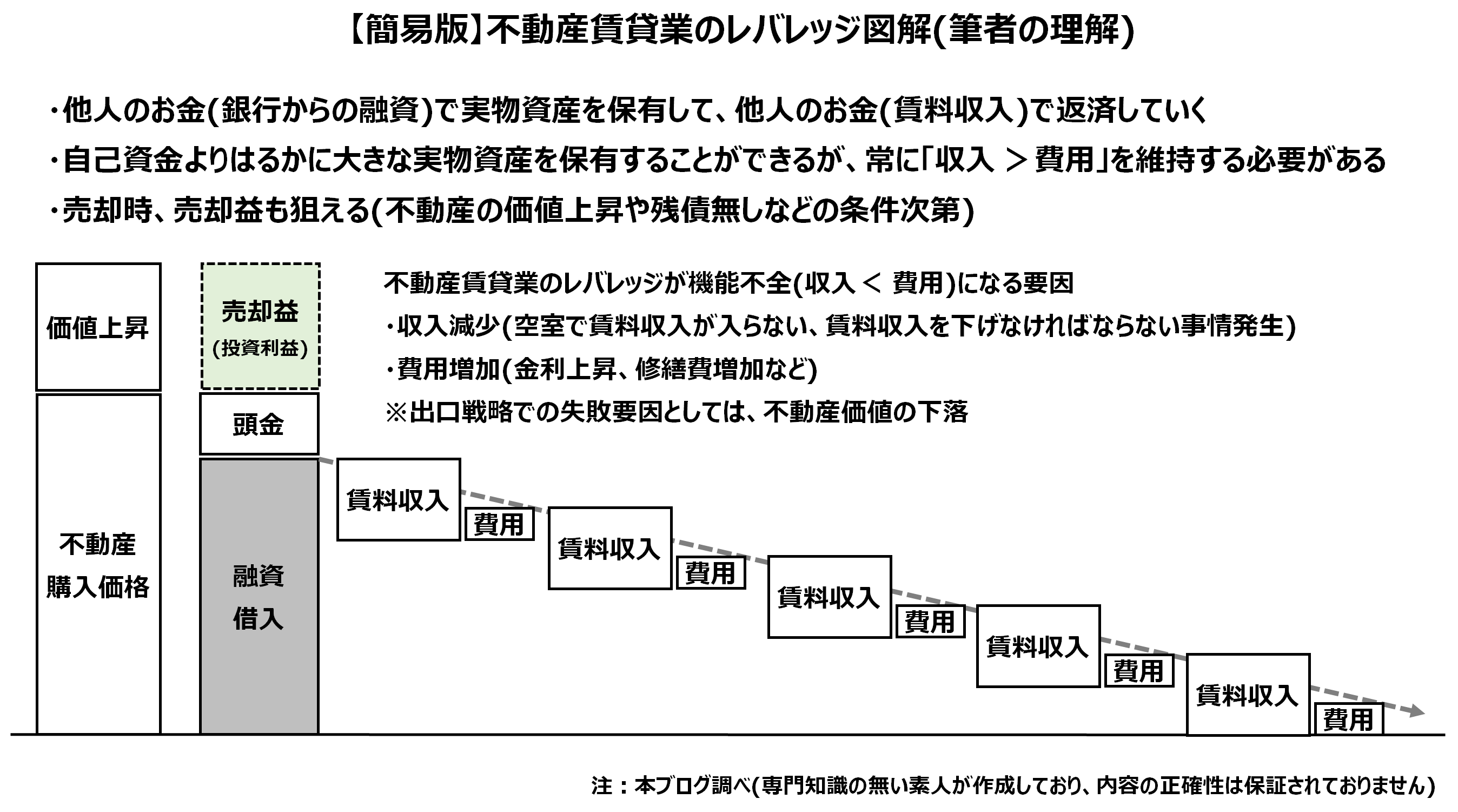 しかし、不動産賃貸業をやることで負う可能性がある損失を理解すると同時に、不動産賃貸業でかけられるレバレッジの魅力も理解しました。