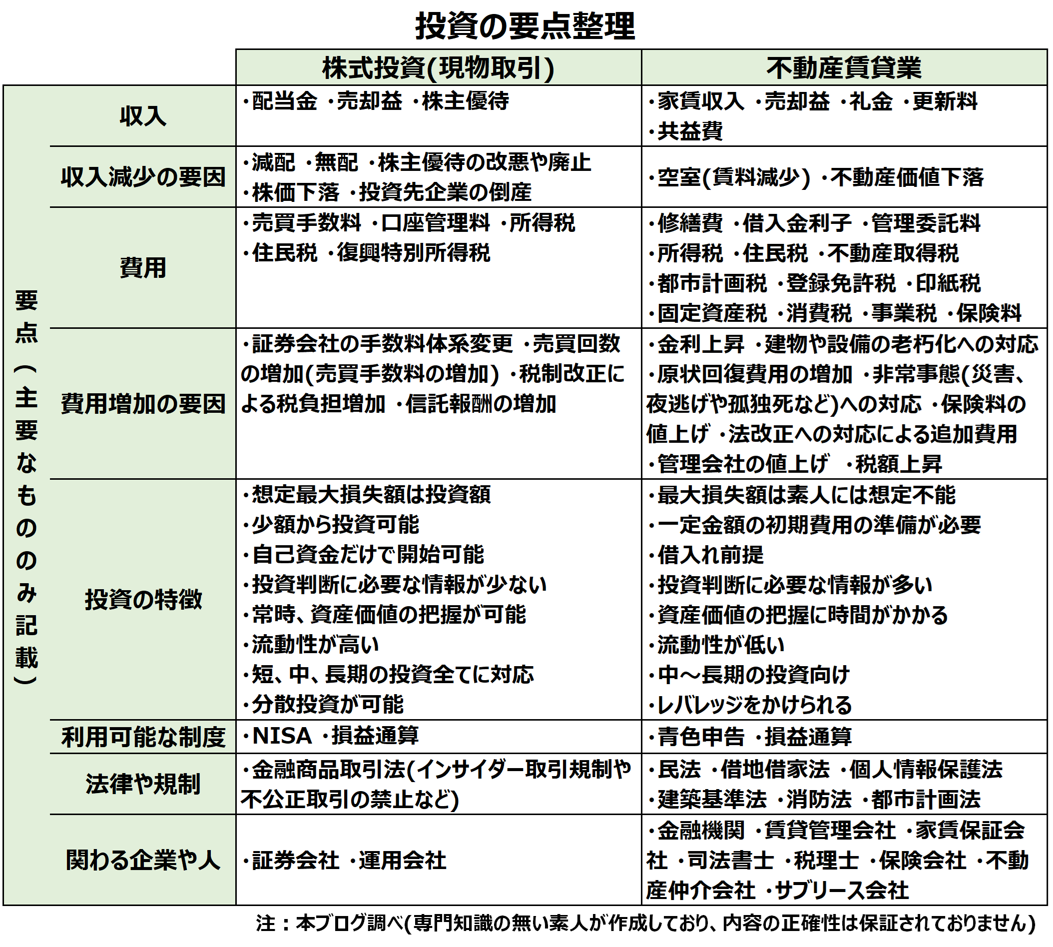 株式投資も不動産賃貸業も素人ですので、内容の正確性は保証されていませんが、私個人として押さえておかなければならないと感じたことだけは漏れないように整理したものとなります。