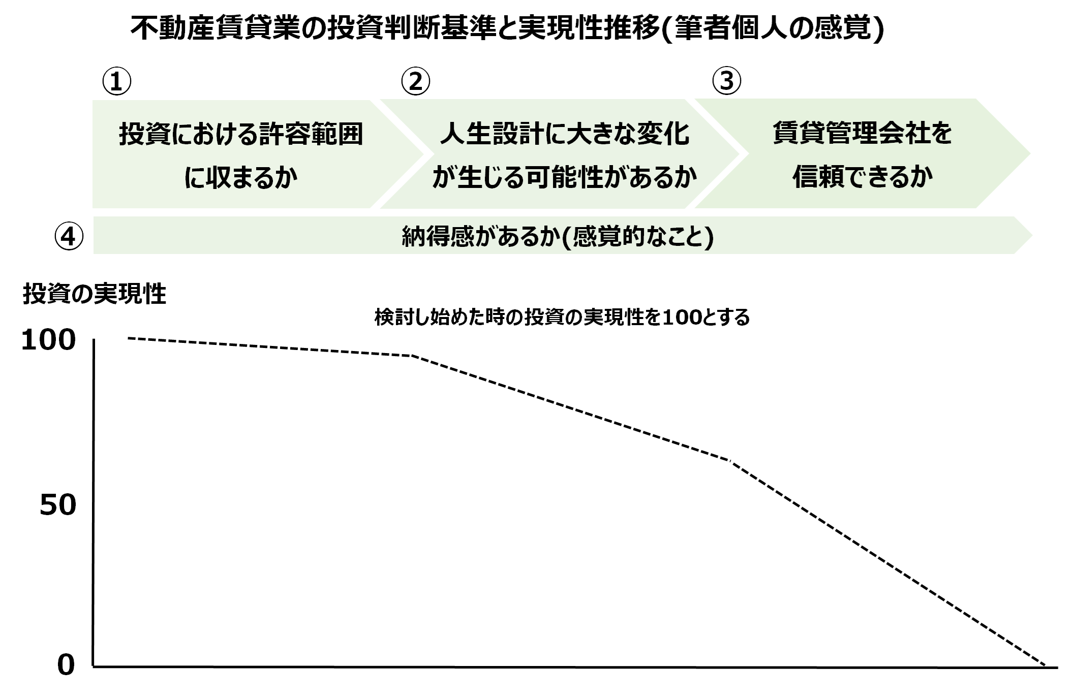 私が投資の実現性を検討する際に参照した基準の内、投資判断に大きな影響を与えたものは次の4つとなります。